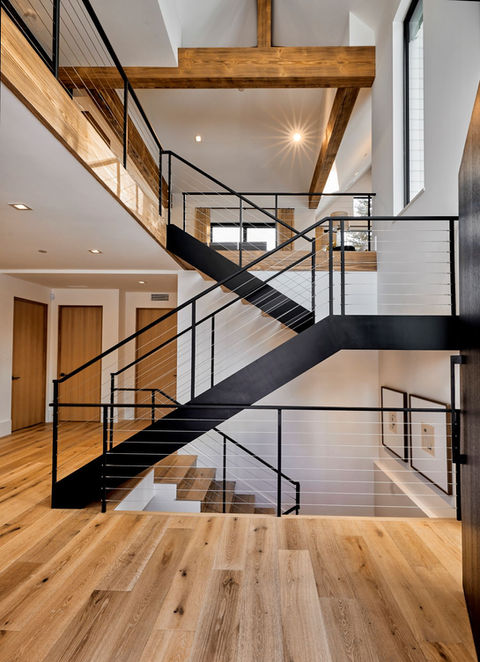 A two-story glass entryway welcomes natural illumination deep into the home, while a sculptural staircase becomes both centerpiece and connector. Each floor reveals intentional flow—spaces that open, lift, and breathe—turning the residence into a sanctuary of continuity and calm.