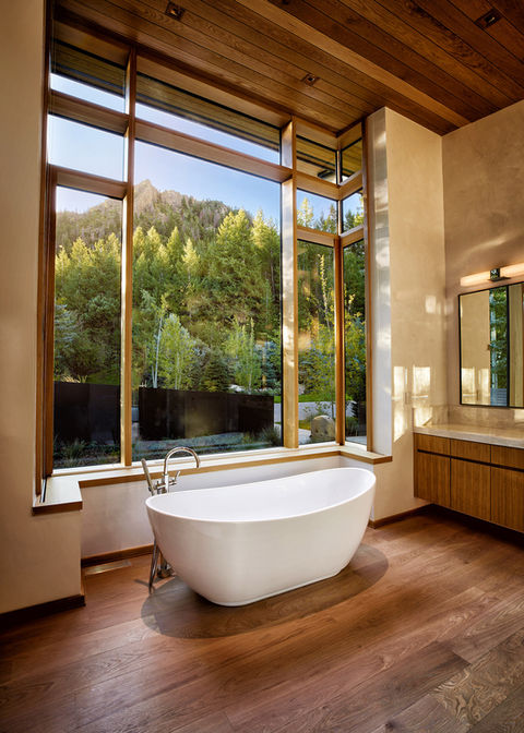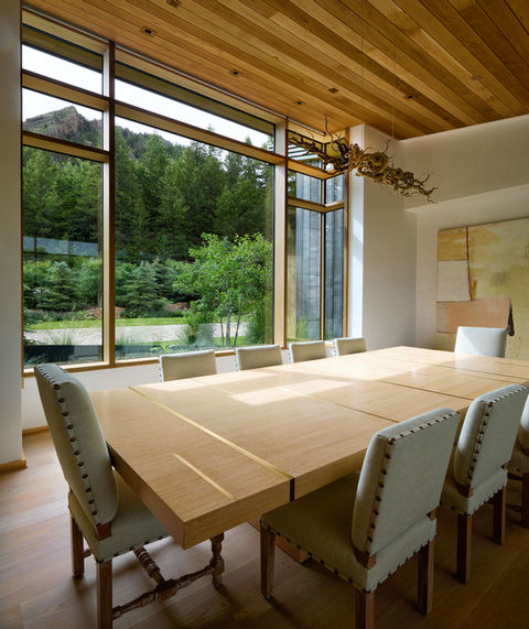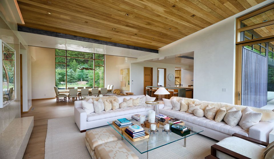 Floor-to-ceiling windows framing panoramic views of meadows and mountains.